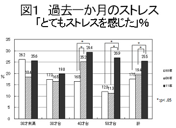 1) 高年齢層(40才台、50才台)の自覚的 健康度がさらに低下し、ストレスの感じ方が急増している。短期的な面では(過去1カ月、1年間のストレスの感じ方等)中高年と同時に30才未満も悪化の兆しがあり(図1)、長期的な意味合いを含む面では(うつ状態)50才台から40才台へ シフトして来ている可能性がある(図2)。